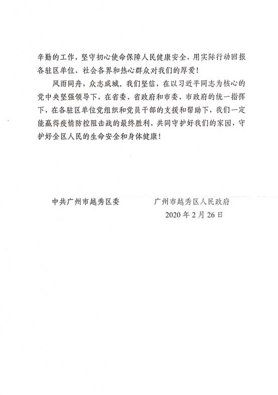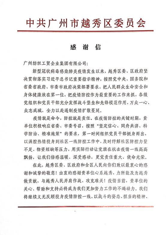 近日,纺织工贸集团收到越秀区委、区人民政府发来的感谢信。感谢信提到,在疫情防控的关键时期,纺织工贸集团严格按照“坚定信心、同舟共济、科学防治、精准施策”的工作要求,在严格做好自身防控工作的同时,积极与街道进行对接,一方面努力调配资源,捐赠一批防疫物资,另一方面大力发动党员干部参与城乡社区防控工作,切实发挥战斗堡垒作用。