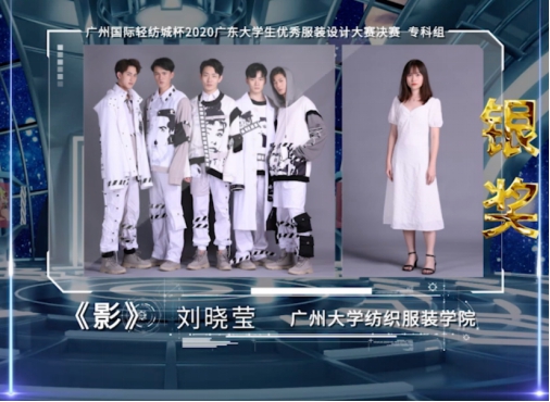本届时装周以“虚拟演播”的全新展现形式,突破时空局限,赋予这个梦想舞台新的使命和价值,来自广东省 28所著名院校的优秀应届毕业生共赴了这座“实现梦想的天桥”,进行青春富有激情的毕业展演。本次大赛最终评选出金奖、银奖、铜奖各1名。刘晓莹同学作品《影》成功进入总决赛,荣膺银奖,指导老师是张译文、陈璐。