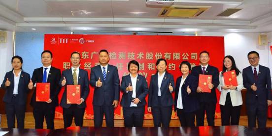 为进一步推动企业“十四五”战略规划落地,增强市场竞争力,建设高素质专业化的经营管理团队。10月25日,广东广纺检测技术股份有限公司举行了一场简单而隆重的职业经理人任期制和契约化管理签约仪式,纺织公司党委书记、董事长简玮仪,党委副书记、纪委书记、工会主席丘海澜,副总经理关勇等领导共同见证这一时刻。